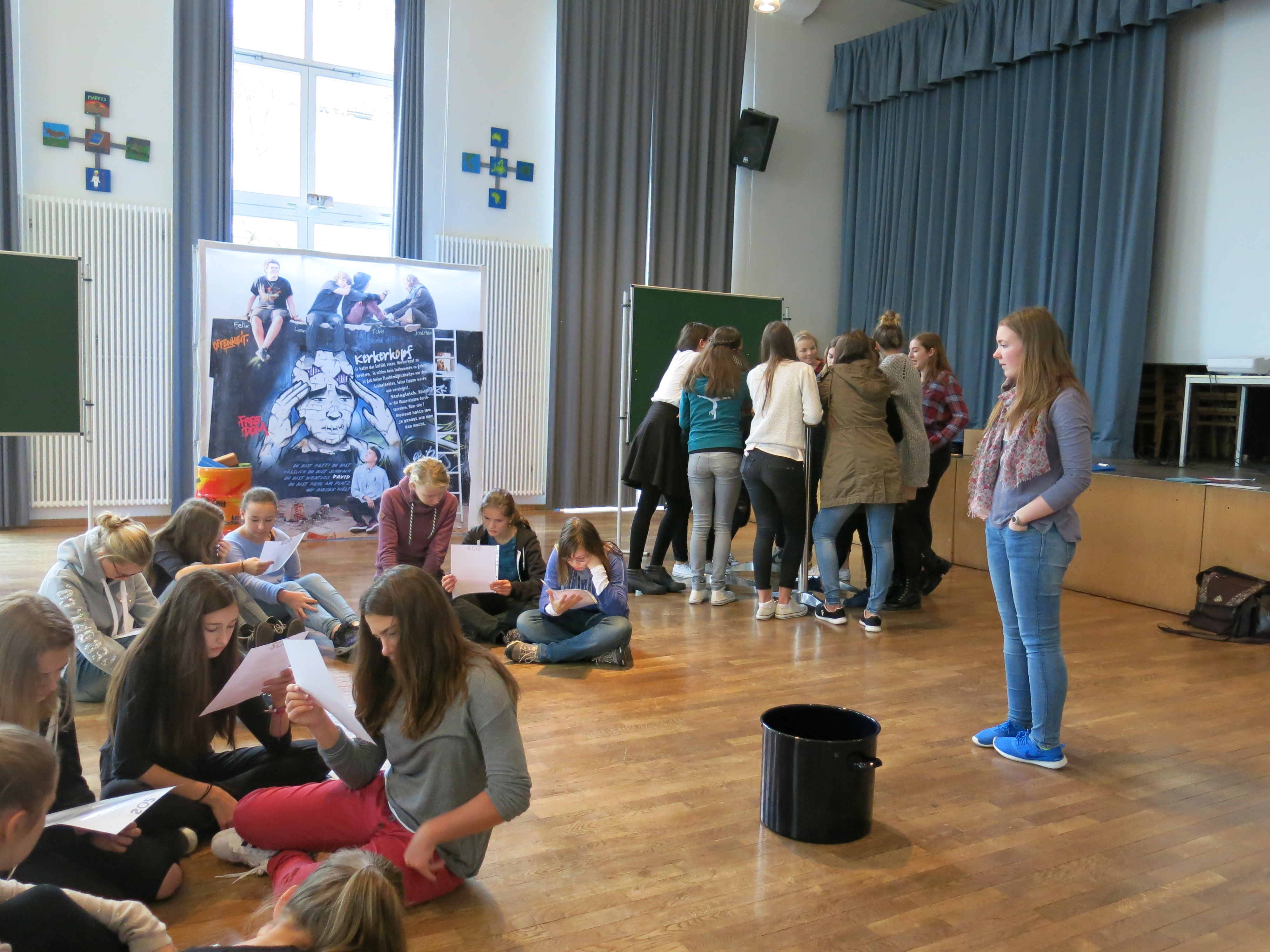 Das mag vielleicht etwas seltsam klingen, war aber fester Bestandteil der Führung durch die Ausstellung „Klang meines Körpers“, die wir für eine Woche an unsere Schule geholt hatten.