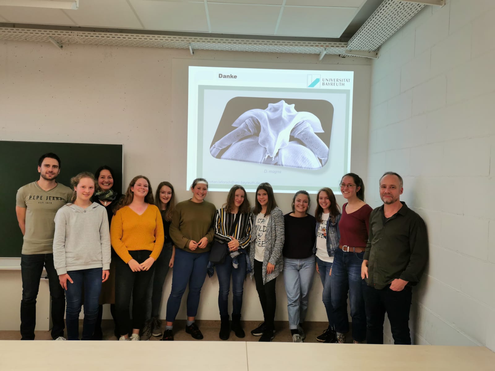 Am 25.10.19 besuchten 10 Schülerinnen der 8. und 10. Klassen zusammen mit Frau Strobel und Herrn Völkl auf Einladung des Sonderforschungsbereiches „Mikroplastik“ die Universität Bayreuth. In dem Sonderforschungsbereich arbeiten 31 Wissenschaftlerinnen und Wissenschaftler aus drei Profilfeldern (Ökologie und Umweltwissenschaften, Polymer- und Kolloidforschung, Molekulare Biowissenschaften) in 16 interdisziplinären Teams. Ziel der Forschungen ist es, ein grundlegendes Verständnis jener Prozesse und Mechanismen zu gewinnen, die je nach Eigenschaften der Kunststoffe die biologischen Effekte von MP bedingen, das Umweltverhalten und die Migration von MP-Partikeln in und zwischen Umweltkompartimenten beeinflussen und die Bildung von MP verursachen.