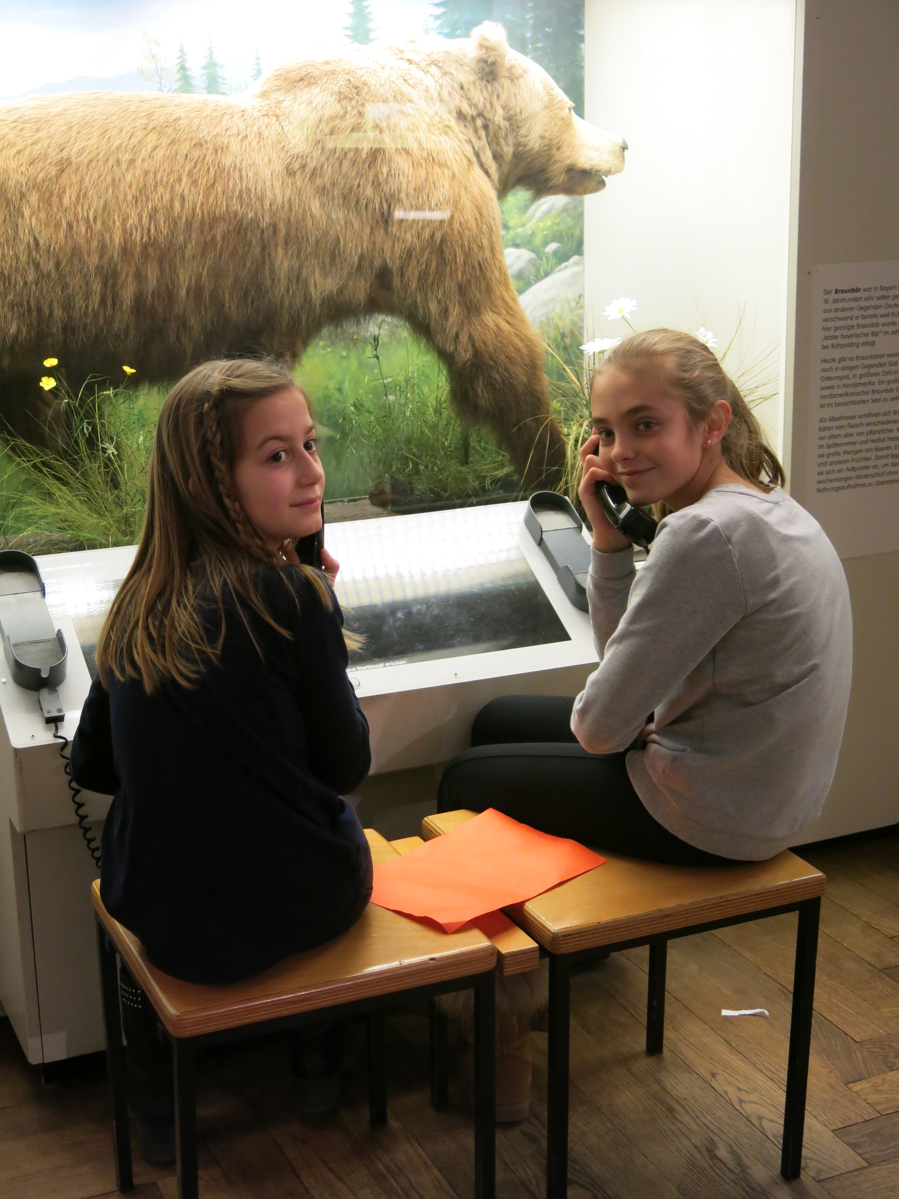 Nach der Führung konnten wir in kleineren Gruppen frei durch das Museum laufen. Besonders gefallen hat uns die Ausstellung „JJ1 – alias Bruno“. In dieser ging es um den Braunbären Bruno, der nach über 170 Jahren als erster Bär auf deutschem Boden frei herumlief und schließlich erschossen wurde. Außerdem hatten wir noch ausreichend Zeit, die Quizfragen zu lösen, die uns unsere Mitschüler gestellt hatten. Das war ganz schön knifflig, aber am Schluss hat unsere Klasse das Quiz gewonnen.