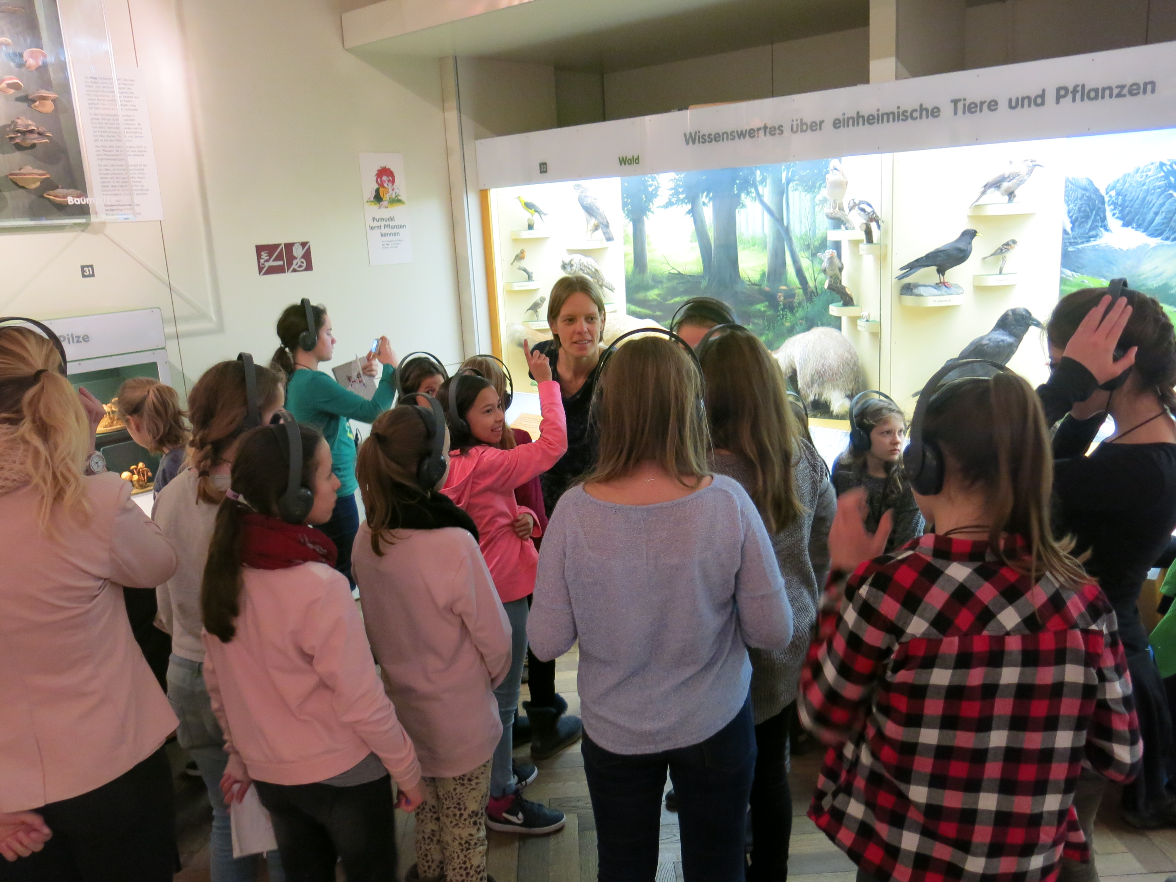 Dort angekommen, teilte sich jede Klasse in zwei Gruppen auf. Während die eine Gruppe ein Quiz vorbereitete, nahm die andere an einer Führung teil. Für die Führung bekam jedes Kind ein Kopfhörersystem. Das sah zwar ein bisschen komisch aus, so als hätte man ein altes Radio um den Hals hängen, aber man konnte die Führerin besser verstehen. Das Thema der Führung wurde an den aktuellen Stoff der jeweiligen Klasse angepasst. Bei uns ging es um „Vögel“. Unsere Führerin zeigte uns unterschiedliche Arten von Federn, Schnäbeln und Krallen und erklärte die Entwicklung vom Dinosaurier zum Vogel.