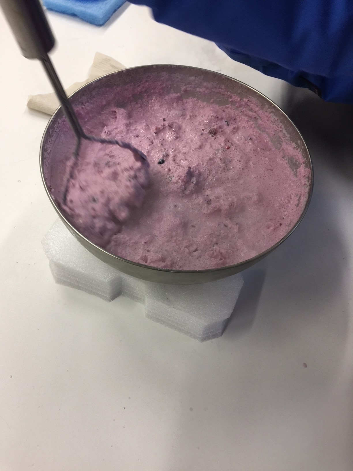 Wir haben uns hier in kleinere Gruppen aufgeteilt, damit jede Schülerin sich an den Experimenten der vielen aufgebauten Stationen versuchen konnte. Es gab Aufgaben verschiedener Themenbereiche, wie z.B. zu den Newton Gesetzen, zum freien Fall, zur magnetischen Kraft, zur Impulserhaltung, zum Energieerhaltungssatz und zum Wirkungsgrad zu meistern. Dieser Teil des Vormittags hat uns sehr viel Spaß gemacht, genauso wie der Folgende, indem wir in zwei Gruppen aufgeteilt, je 2 Labore angesehen haben. Die eine Gruppe ging zuerst in ein Labor der physikalischen Chemie, wo wir aber nicht ohne Laborkittel, die wohl eher für größere Leute gefertigt wurden, und Schutzbrille hinein durften. Im Chemielabor erklärte uns ein Fachmann, wie und weshalb Leuchtstoffe produziert werden. Unter einer UV-Lampe wurden uns verschiedenfarbige Leuchtstoffe gezeigt. Besonders interessant fanden wir die Erkenntnis, dass die fluoreszierenden Farben nicht nur zur Beleuchtung dienen, sondern beispielsweise auch an Notausgängen oder auf Euroscheinen zum Schutz vor Fälschungen genutzt werden. Zum Abschluss dieser Führung durfte jede noch ein kleines Kügelchen aus Glas mitnehmen; dieses entstand durch starkes erhitzen und zuführen von Metall- und Kupferionen mit daran anschließendem Abkühlen. Danach ging es in ein Labor wo Kristalle gezüchtet werden. Dabei dachte natürlich jede von uns an die Kristallzuchtsets aus Kindheitstagen – wie sich jedoch herausstellte, war damit eine andere Art gemeint. Die Stoffe, mit denen gearbeitet wird, werden in luftundurchlässigen Argonkästen aufbewahrt, damit sie nicht rosten können. Die Kristalle werden in Öfen, die bis zu 900°C heiß werden können, gezüchtet und danach abgekühlt oder sie wachsen in Wasser. Abschließend zur Führung durften wir alle einen Kristall mikroskopieren. Schließlich trafen wir uns wieder alle im Experimentiersaal und machten, wie bei unserem letzten Besuch in der Uni Augsburg auch schon, das begehrte „Stickstoffeis“ mit Frau Trometer, das wieder ausgezeichnet geschmeckt hat.